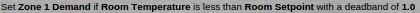 Important Concept: Some fields in some rules can refer to a data element OR may simply have a numeric value. This provides flexibility: If the parameter is something that you might want to set via another rule or from the user interface, use a variable. If it's a simple value that's unlikely to change, just use the numeric value, For example, consider a rule that determines whether a zone needs heat. It could compare the current temperature to a fixed numeric value (68 in this case).