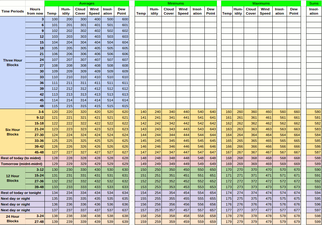 The table below shows the element IDs that correspond to different forecast data. To use this table, find the column for the type of data you want (Maximum Temperature or Average Cloud Cover, for instance). Then find the row for the time period you want. The element ID in the selected row and column will provide the data that you want.